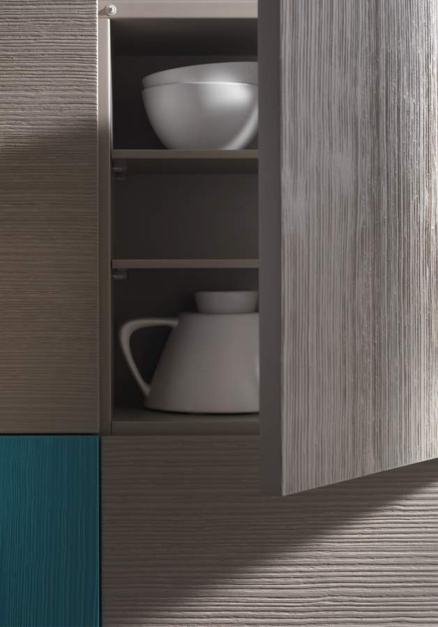 Moderni elementi pensili 1000 Per 1000 in larice scavato con 4 ante battenti ammortizzate completi di ripiano interno in vetro trasparente